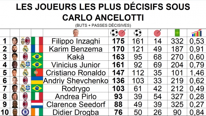 02月05日讯 数据博主PopFoot盘点了安切洛蒂教练生涯中,他所执教球员的直接参与进球排行。其中,菲利普·因扎吉最多,本泽马第2,卡卡第3,C罗第5。