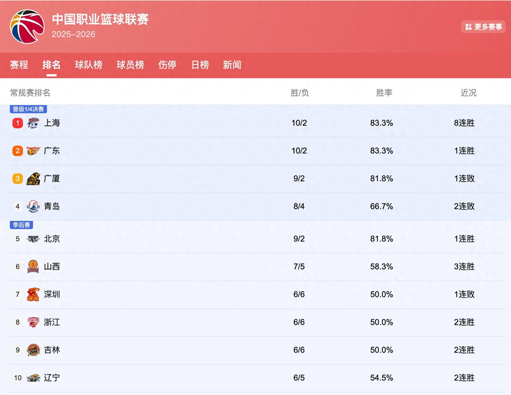 首先可以看一下前三的球队,分别是上海队、广东队以及广厦队。这三个球队最近的表现非常的火热。接下来如果说能够把这个成绩稳定下去,本赛季极有可能能够成为争冠的三强球队。其中我们可以看到,广东男篮虽然说目前是排在第二名,但是本赛季他们的目标其实是冲击榜首,争夺冠军。