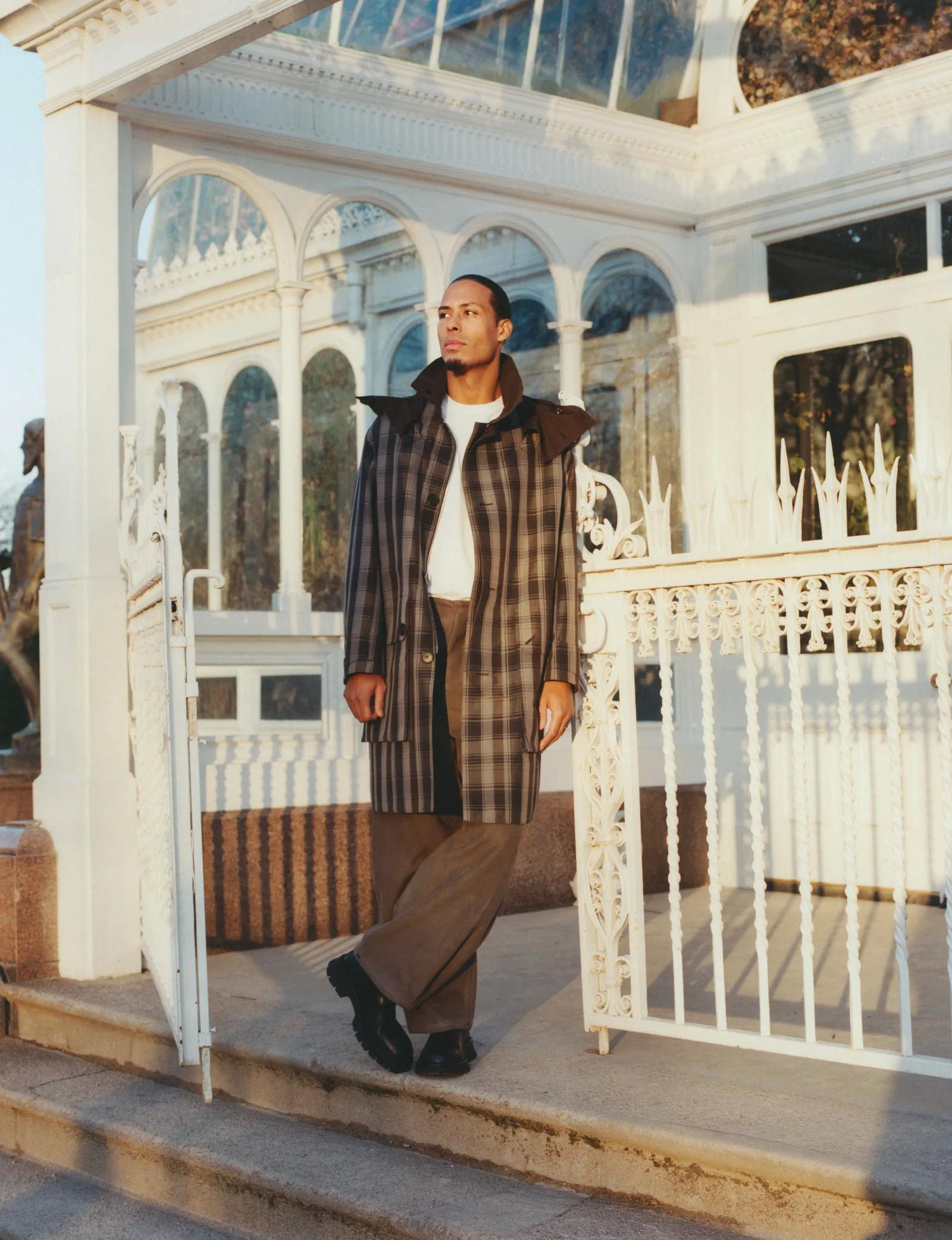 通常是被称为“大维吉”的范戴克让别人显得渺小。身高1米93的他,被认为是英超最具威慑力的中后卫之一,球迷推崇他在防守中轻松贴防并限制顶级前锋的能力,包括姆巴佩、哈兰德和凯恩。在拍摄现场,他同样显得游刃有余。身穿爱马仕格纹服装仰头迎接冬日最后的阳光,换上Sacai米色套装跨坐在椅子上直视镜头,脚踩Jacquemus运动鞋,伴随Omah Lay的音乐轻轻起跳。谈及镜头前的从容,34岁的范戴克表示:这里的环境让所有人都能放松下来,希望最终呈现的效果会很好。